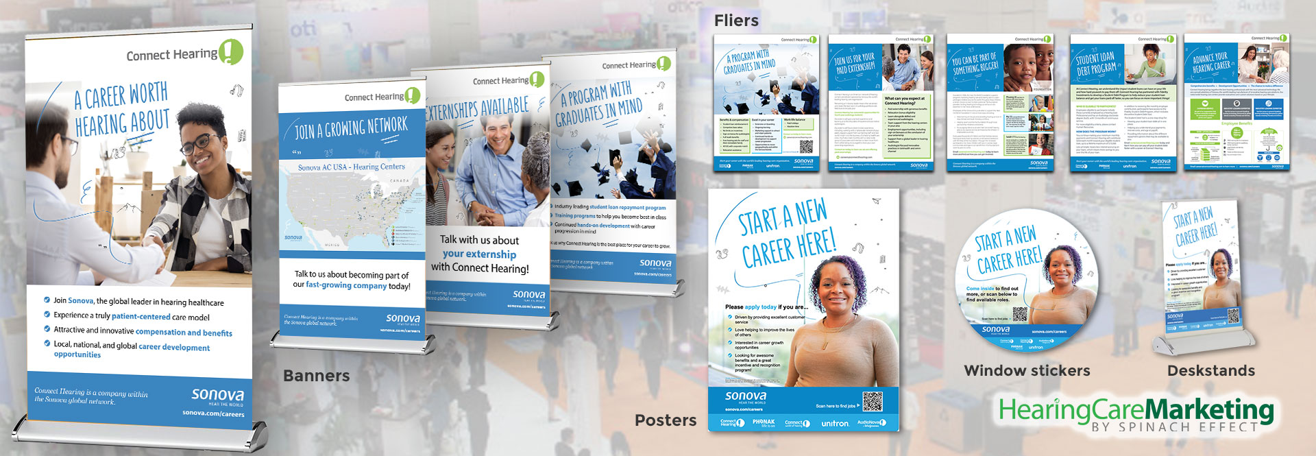 The ability of hearing care organizations to attract audiological and front office talent is critical to success and growth. Given our relationship with Connect Hearing USA, we were asked to assist their HR Department in the development of a "HR Brand" and a range of materials that would make Sonova stand out from the crowd at recruitment, education, and audiological expos around the country.